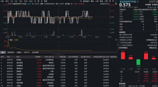 1月23日,吃喝板块震荡盘整,反映吃喝板块整体走势的食品饮料ETF华宝(515710)全天于水面附近震荡。成份股方面,大众品涨幅居前。截至发稿,莲花控股大涨超4%,星湖科技、酒鬼酒、金达威等多股涨超1%;下跌方面,部分白酒股表现不佳,截至发稿,山西汾酒、洋河股份等小幅飘绿,拖累板块走势。