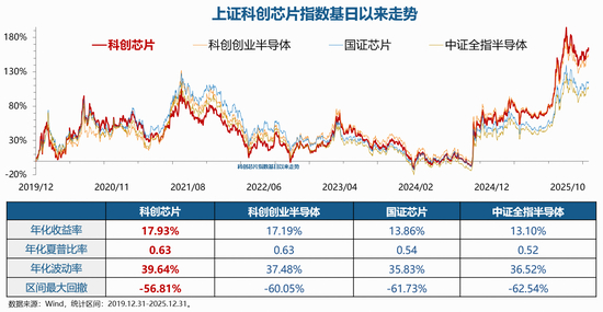 得益于颇具特色的成份股结构,上证科创板芯片指数自基日以来的长期表现突出,收益和回撤等多项指标在同类指数中有明显优势。2019.12.31至2025.12.31期间,上证科创板芯片指数年化收益率为17.93%,显著超越科创创业半导体、国证芯片、中证全指半导体等同类指数同期17.19%、13.86%、13.10%的涨幅表现;上证科创板芯片指数同期内最大回撤为-56.81%,亦优于科创创业半导体、国证芯片、中证全指半导体等同类指数同期-60.05%、-61.73%、-62.54%的最大回撤。