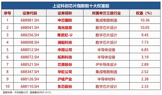 截至2025年12月末,上证科创板芯片指数成份股涵盖50只国产芯片产业链公司,其中国产芯片龙头——中芯国际权重占比10.36%,海光信息权重占比达10.05%,寒武纪权重占比9.45%。该指数的编制规则设置单个成份股权重上限为10%,该指数样本每季度调整一次,其挂钩ETF产品日涨跌幅限制为20%。