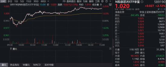 今日“全芯”上市的科创芯片ETF华宝(589190)下探回升,场内价格一度涨超3%,收涨2.72%,全天成交额1.19亿元,换手率31.2%,交投活跃。