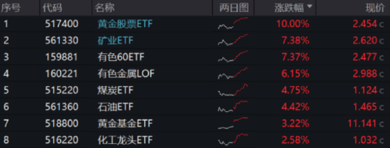 现货黄金价格加速上冲站上5200美元/盎司整数关口,黄金股票、有色金属板块大涨。截至收盘,黄金股票ETF大涨10.00%,矿业ETF大涨7.38%,有色60ETF大涨7.37%。
