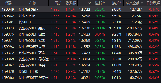 1月30日,沪指早盘收复4100点,创业板指探底回升,收涨0.80%。在此背景下,创业板50ETF(159949)上涨1.42%,报1.569元,换手率为5.09%,成交额达12.12亿元,居同类标的ETF首位。