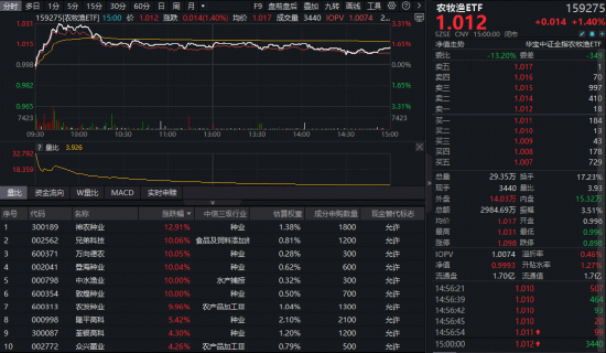 农牧渔板块今日逆市大涨,全市场唯一*农牧渔ETF(159275)开盘后迅速冲高,盘中场内价格最高涨幅达到3.31%,随后略有回落,截至收盘,涨1.4%。