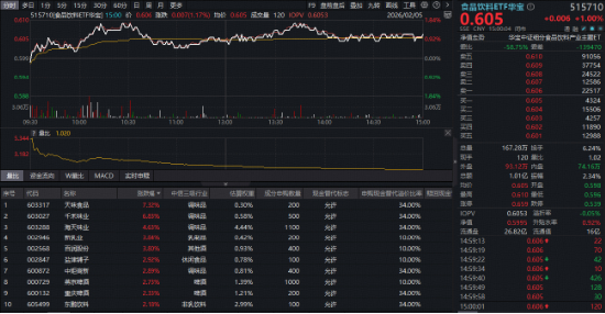 吃喝板块攻势不止!反映吃喝板块整体走势的食品饮料ETF华宝(515710)开盘后迅速拉升,盘中场内价格最高涨幅达到1.84%,截至收盘,逆市涨1%。