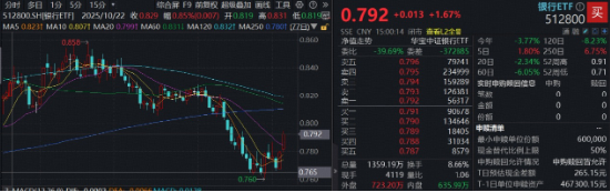 全市场规模最大的银行ETF(512800)高开高走,午后进一步上冲,场内价格一度涨近2%,收涨1.67%,站上20日线,全天成交额10.71亿元,环比放量超3亿。