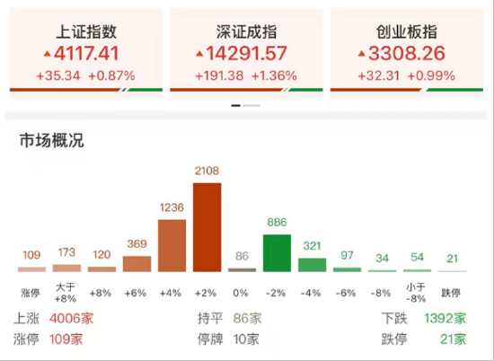 市场今日冲高回落,创业板指盘中一度涨超2%。沪深两市成交额2.2万亿,较节前最后一个交易日放量2194亿。盘面上,市场热点快速轮动,油气、电网、化工等板块涨幅居前,影视院线下跌。截至收盘,沪指涨0.87%,深成指涨1.36%,创业板指涨0.99%,中证A500指数涨1.20%。