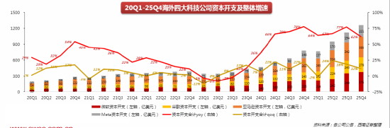 此外,从资本开支来看,海外云厂商25年实际数据及26年指引均超出市场预期,体现对AI基础设施的需求依旧旺盛,利好上游相关企业。2025年海外四大科技公司合计支出4100亿美元,同比增长67%;2026年谷歌、亚马逊、Meta的资本开支指引均远超市场预期。最后,在科技竞争及政策支持的背景下,我们长期看好AI基础设施领域的国产替代机会。