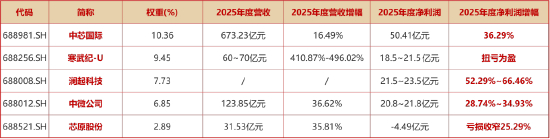 值得一提的是,芯片产业的高景气已在业绩端得到验证。以上证科创板芯片指数权重股为例,寒武纪-U预计2025年实现营收60-70亿元,同比增长410.87%-496.02%,预计实现归母净利润18.5-21.5亿元,实现扭亏为盈;此外,中芯国际、澜起科技、中微公司等居实现盈利可观增幅,显示行业周期上行势头强劲。