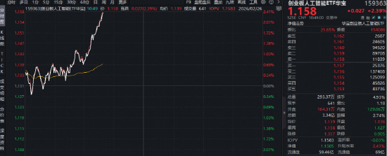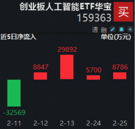 或由于英伟达最新财报大超市场预期,今日(2月26日)重仓光模块龙头的创业板人工智能ETF(159363)场内价格逆市拉升2.39%,早有资金提前进场埋伏,数据显示,此前4日该ETF连续吸金5.32亿元。