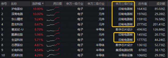 成份股方面,PCB(印制电路板)龙头显著领涨,沪电股份、深南电路涨停,东山精密涨超9%,胜宏科技涨逾8%。此外,寒武纪涨超8%,芯原股份、长电科技等个股跟涨。