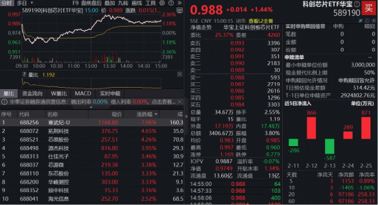 今日算力芯片先抑后扬,午后直线猛拉,全“芯”科创芯片ETF华宝(589190)迅速冲高,场内价格一度涨超2%,收涨1.44%。从日k线看,科创芯片ETF华宝(589190)自2月6日刷新阶段低点以来持续向上修复,今日进一步刷新本月收盘新高,整体维持偏强趋势。