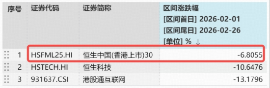 数据显示,2026年2月以来,恒生中国(香港上市)30指数累计下跌6.81%,低于同期恒生科技指数(-10.65%)、中证港股通互联网指数(-13.18%)跌幅,在港股市场整体出现明显调整大背景下表现出相对抗跌性,期间港股红利资产部分形成了对冲保护。