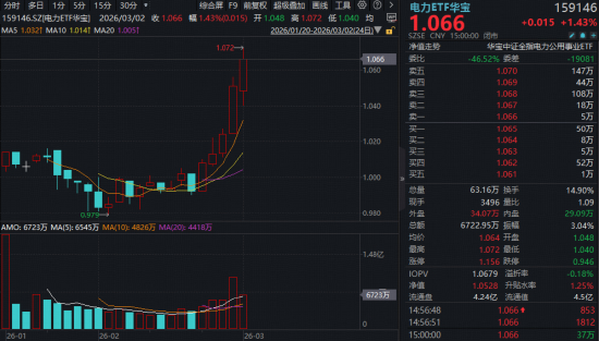 热门ETF方面,“HALO”核心资产——电力ETF华宝(159146)场内收涨1.43%再创新高,日线斩获五连阳,全天成交超6700万元,交投持续活跃。