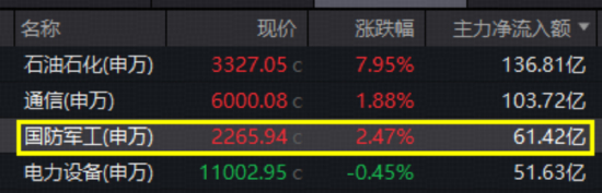 地缘政治风险加剧,A股军工板块果然崛起,主力资金大举扫货,全天净买入国防军工超61亿元,排名申万全行业第三,仅次于石油石化和通信。