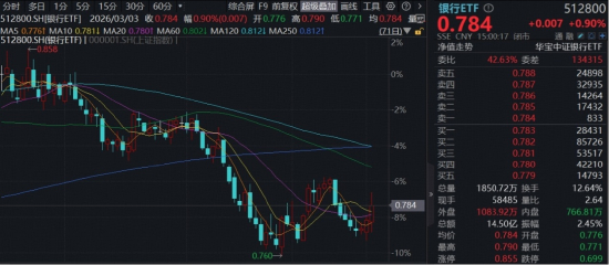 地缘冲突加剧导致全球避险情绪升温,银行股逆市走强。全市场规模最大的银行ETF(512800)场内价格一度上涨1.67%,收涨0.9%,日线稳步3连阳,收复10日、20日两条重要均线,全天成交额14.5亿元,创2025年12月以来天量。