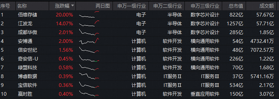 成份股方面,存储芯片概念反弹,佰维存储20CM涨停,江波龙涨超14%软件开发行业亦有亮眼表现,安博通涨超2%,信安世纪涨逾1%,奇安信绿盟科技等个股逆市飘红。