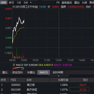 3月4日早盘,军工止跌向上!军工核心资产——军工ETF华宝(512810)低开后快速拉起,一度上探1.28%,振幅超3.5%。成份股海兰信领涨逾6%,航天彩虹应流股份涨逾3%。
