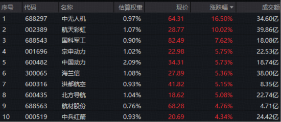 航空航天、地面兵装、航海装备相关成份股涨幅居前,中无人机盘中飙逾18%创历史新高,航天彩虹涨停3天2板,国科军工涨7.62%,宗申动力、中国动力、海兰信等多股涨超5%。