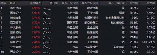 成份股方面,永兴材料涨近7%,国城矿业涨逾5%,博威合金、西部超导、神火股份涨超3%,盛新锂能、楚江新材、华峰铝业等个股跟涨。