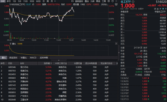 成份股方面,石化股涨幅居前。截至发稿,恒力石化、恒逸石化双双大涨超5%,荣盛石化涨超4%,其余细分板块部分个股亦表现亮眼,博源化工、天赐材料涨超4%,金发科技、亚钾国际、广东宏大等涨超2%。