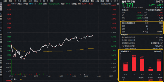 热门ETF方面,揽尽有色金属行业龙头的有色ETF(159876)全天震荡上行,场内价格现跌0.59%,截至发稿,获资金实时净申购600万份,此前5个交易日连续吸金,合计狂揽1.46亿元,反映资金看好有色金属板块后市,积极进场抢筹!