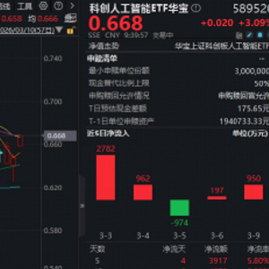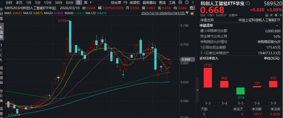 今日(3月10日)AI赛道王者回归!重点布局国产AI产业链的科创人工智能ETF(589520)场内价格猛拉3.09%,冲击日线3连阳!上交所数据显示,该ETF此前5个交易日累计吸金3917万元,反映资金看好国产算力后市表现,积极进场抢筹!
