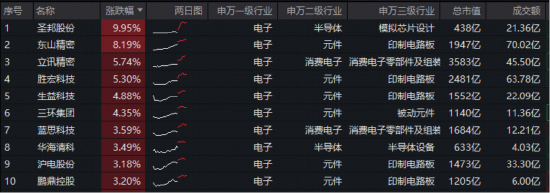 成份股方面,苹果产业链个股显著领涨,圣邦股份涨超9%,东山精密涨逾8%,立讯精密、胜宏科技、生益科技等个股大幅跟涨。