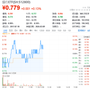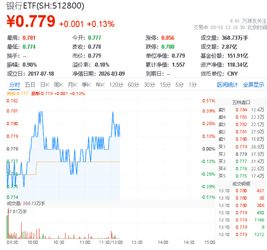 3月10日,截至13时7分,银行表现活跃,中证银行指数上涨0.2%,成份股方面,民生银行领涨1.55%,华夏银行上涨1.46%,浦发银行上涨1.22%。热门ETF方面,华宝基金银行ETF(512800)场内价格上涨0.26%,成交额达2.86亿元。