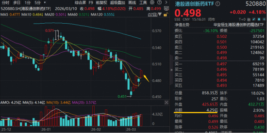 3月10日,创新药再度领跑,高弹性港股通创新药ETF(520880)盘中上攻5%,收涨4.18%站上10日线,放量成交4.25亿元。医疗股亦呈普涨态势,港股通医疗ETF华宝(159137)迅猛回血3.25%。