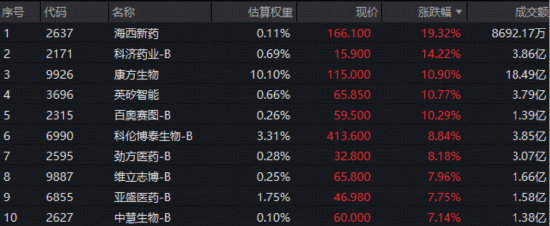 聚焦港股通创新药板块,新入通标的狂欢,海西新药暴涨19.32%,科济药业-B、英矽智能涨14.22%、10.77%。权重股康方生物三抗新药获批临床,股价应声涨近11%四连阳。