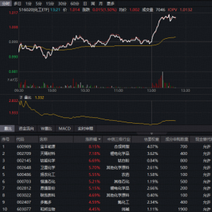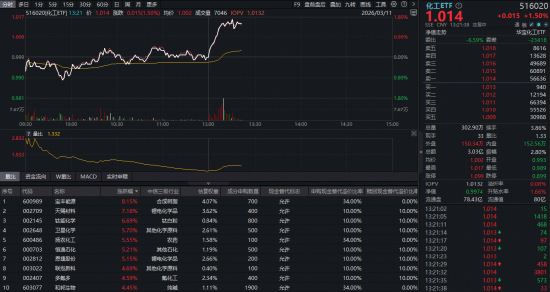 化工板块今日(3月11日)午后突然猛拉,截至发稿,反映化工板块整体走势的化工ETF(516020)场内价格大涨1.5%。
