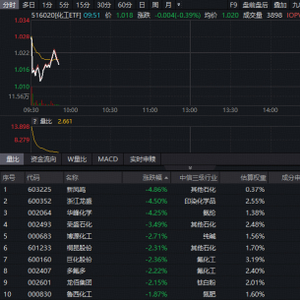 化工板块今日(3月12日)震荡盘整,反映化工板块整体走势的化工ETF(516020)早盘高开后迅速回落,而后持续于水面附近震荡,截至发稿,场内价格跌0.39%。