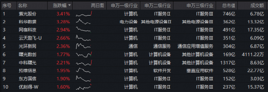成份股方面,紫光股份、科华数据领涨超3%,网宿科技、云天励飞-U、光环新网、中科曙光涨逾2%,曙光数创、拓维信息等个股跟涨。