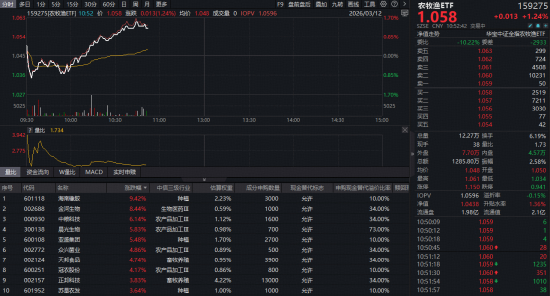 农牧渔板块今日(3月12日)盘中迅速拉升,全市场首只农牧渔ETF(159275)开盘后短暂低位震荡,而后突然拉升翻红,截至发稿,场内价格涨1.24%。