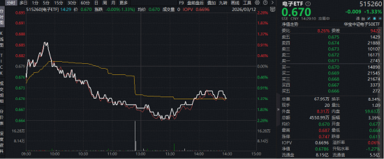 热门ETF方面,周四(3月12日)覆盖苹果、英伟达等热门科技巨头产业链的电子ETF(515260)场内价格早盘拉升1%,后随市震荡回调,场内价格现跌1.33%,值得一提的是,该ETF昨天单日吸金545万元,或有资金看好电子板块后市表现,提前进场埋伏!