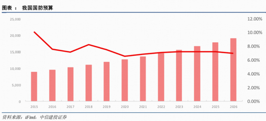 根据日前发布的2026年中央和地方财政预算草案报告,2026年我国国防支出为19095.61亿元人民币,同比增长7%。中信建投证券预计,十五五期间我国国防预算仍将保持 7-7.5%左右的稳定增长,占 GDP 比重或有一定提升空间。