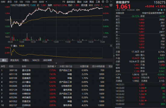 【政策暖风频吹引爆行情,华宝基金农牧渔ETF(159275)收涨1.53%续创上市新高!机构力挺农牧渔赛道】