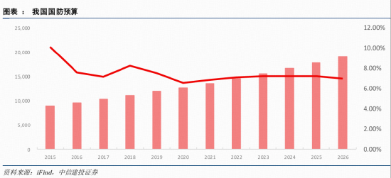 根据日前发布的2026年中央和地方财政预算草案报告,2026年我国国防支出为19095.61亿元人民币,同比增长7%。中信建投证券预计,十五五期间我国国防预算仍将保持 7-7.5%左右的稳定增长,占 GDP 比重或有一定提升空间。
