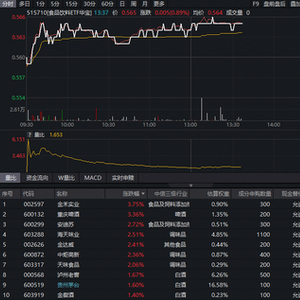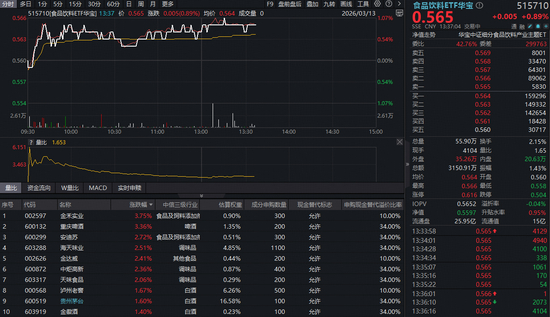 吃喝板块今日(3月13日)表现强势。反映吃喝板块整体走势的食品饮料ETF华宝(515710)持续红盘震荡,盘中场内价格最高涨超1%,截至发稿,涨0.89%。