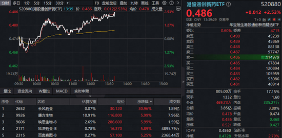 3月16日午后,港股通创新药板块再度拉升,100%创新药研发标的——港股通创新药ETF(520880)表现活跃,场内价格现涨2.53%,成交额为3.77亿元。