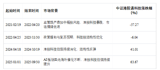 中证港股通科技指数自2020年以来经历了多个市场周期,展现出穿越周期的韧性。以下为各阶段表现(数据来源:Wind):