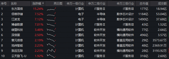 成份股方面,东方国信领涨超15%,佰维存储、江波龙、博睿数据涨逾7%,绿盟科技、深信服、普元信息、地纬智能、致远互联等个股跟涨。