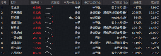 成份股方面,半导体龙头江波龙领涨超6%,澜起科技涨逾3%;光模块龙头天孚通信涨超5%,新易盛涨逾3%,中际旭创涨超2%;此外,光伏龙头阿特斯涨超3%,亦有亮眼表现。