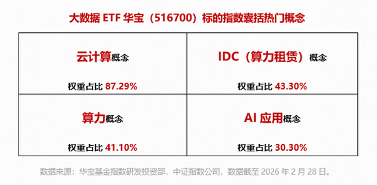 深度绑定国产算力(IDC、服务器)、AI应用领域的大数据ETF华宝(516700)被动跟踪中证大数据产业指数,涉及大数据存储、大数据生产、大数据分析、大数据运营平台、大数据应用等领域,权重股汇聚中科曙光、科大讯飞、紫光股份、浪潮信息、中国长城、中国软件等龙头股。