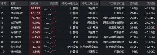 成份股方面,数据港涨停,东方国信领涨超16%,优刻得-W涨逾12%,光环新网、云赛智联涨超9%,网宿科技、奥飞数据、润泽科技等个股跟涨。