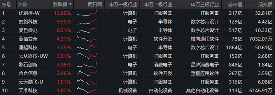 成份股方面,优刻得-W涨超13%,安路科技涨近10%复旦微电、亚信安全、澜起科技、云从科技-UW等个股大幅跟涨。
