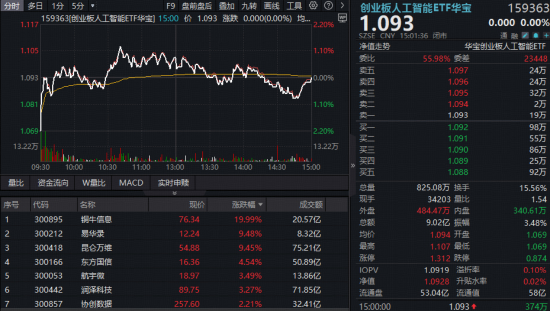 算力方面,创业板人工智能逆市连阳,铜牛信息20CM涨停创新高,易华录涨超9%,润泽科技、新易盛、天孚通信等多股涨超1%。同类规模最大的创业板人工智能ETF华宝(159363)昨日大涨5.6%后,今日低开高走,场内逆市连阳,放量成交超9亿元!