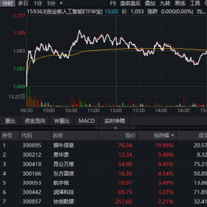 算力方面,创业板人工智能逆市连阳,铜牛信息20CM涨停创新高,易华录涨超9%,润泽科技、新易盛、天孚通信等多股涨超1%。同类规模最大的创业板人工智能ETF华宝(159363)昨日大涨5.6%后,今日低开高走,场内逆市连阳,放量成交超9亿元!
