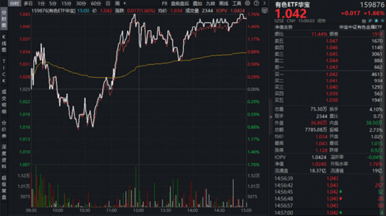 有色金属板块领涨两市,揽尽有色金属行业龙头的有色ETF华宝(159876)场内涨幅最高上探1.76%,收涨1.66%,全天成交额7785万元,环比小幅放量。