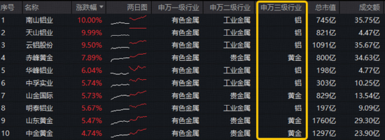细分方向来看,铝业龙头和黄金龙头显著领涨,铝业龙头方面,南山铝业、天山铝业涨停;黄金龙头方面,赤峰黄金涨超7%,山金国际涨逾5%,山东黄金、中金黄金等个股跟涨。